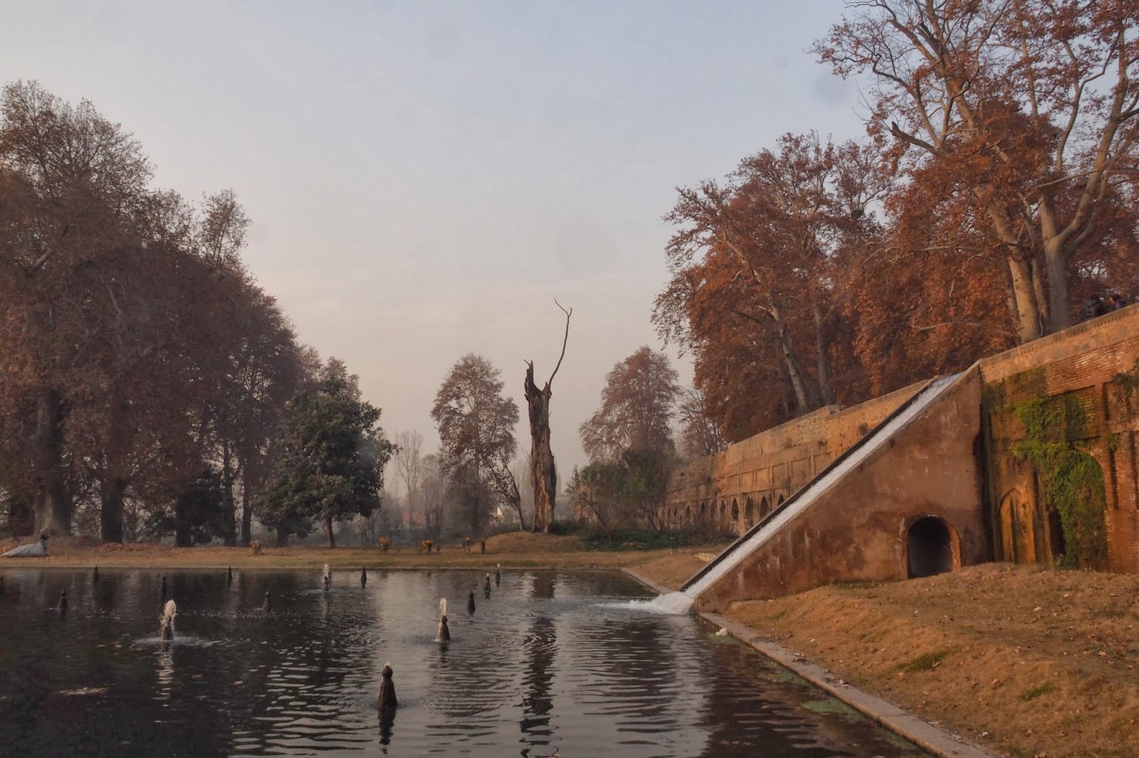 The Shalamar Garden is based on the so-called Islamic Persian gardens in the form of a square with four radiating arms from a central water source. But to get water a central channel had to be built through the garden axially from its highest to the lowest of its three stepped terraces, leaving out the radial arms so that its shape is rectangular rather than square.It covers 12.4 hectares (31 acres). Each of its 3 terraces has fountains and chinar (sycamore) trees. The garden was linked to the open Dal Lake water through a 12 yard wide canal about a mile long that ran through the swampy quagmire. The lakeside is planted with willow trees with broad green paths lined with rows of chinar trees. The garden has trellised walkways lined by avenues of aspen trees planted at 2 feet interval.